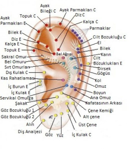 Vücutta enerji kanalları dışında her organ ve sistemin temsil edildiği nokta ve alanlar içeren mikro sistemler mevcuttur. Kafa derisi, yüz, el, ayak ve kulak kepçesi gibi. Kulak kepçesinde vücudun her bir organının izi olduğu kabul edilerek, hastalıklı organ kulaktan tespit edilebilir. Hastalıklı olduğu belirlenen organ kendini temsil eden noktaların uyarılması veya iğnelenmesi ile yine kulaktan tedavi edilebilir. Başta ağrılar olmak üzere pek çok hastalık ve fonksiyon bozukluğu kulak kullanılarak iyileştirilebilir.